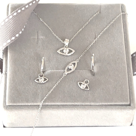 Sterling Silver Set of Bright Evil Eye Necklace, Bracelet and Hoop Earrings