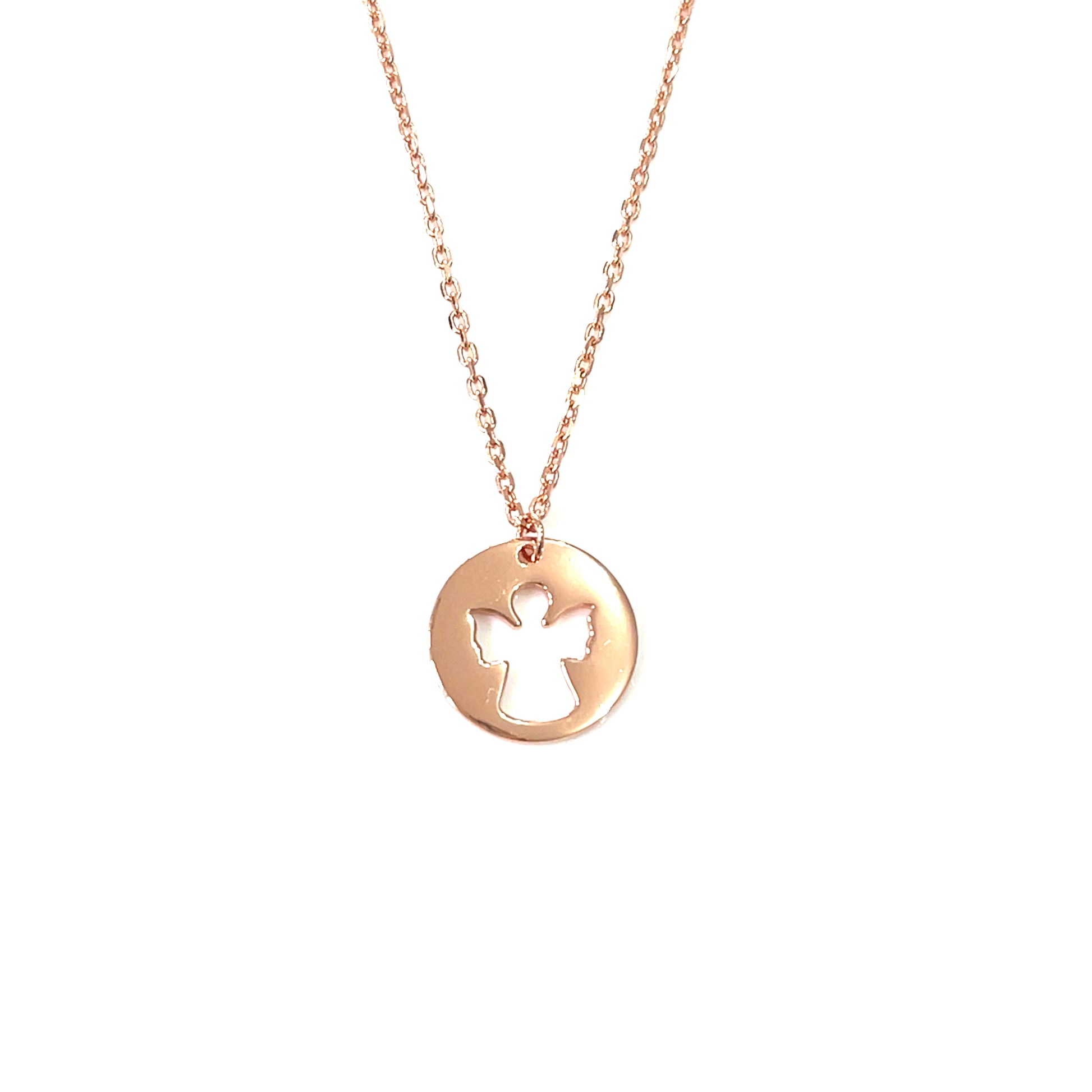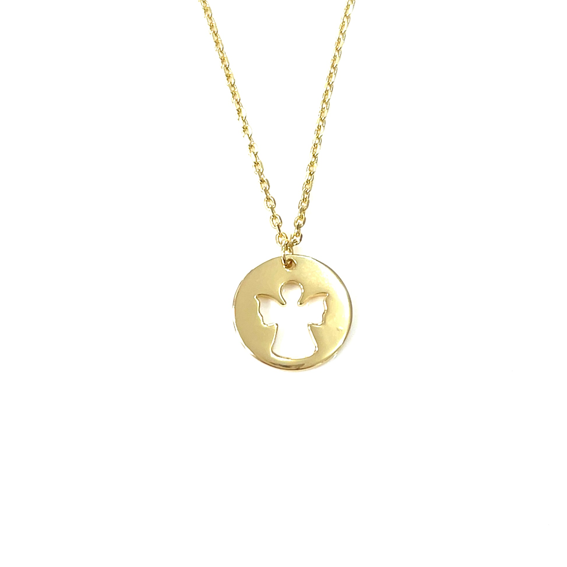 This circular pendant features a cut-out angel silhouette with wings and halo, crafted in gold-tone, rhodium plated sterling silver. Suspended from a delicate matching chain, it’s a meaningful piece that blends minimalist design with heartfelt symbolism — perfect for everyday wear or as a thoughtful gift.