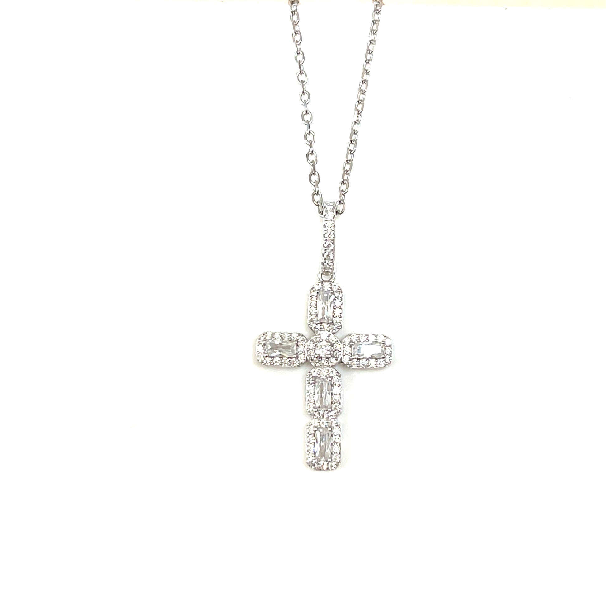 A bold cross pendant featuring baguette-cut cubic zirconia framed with fine cz pave setting. This piece balances symmetry and brilliance, making it radiant expression of faith and fashion.