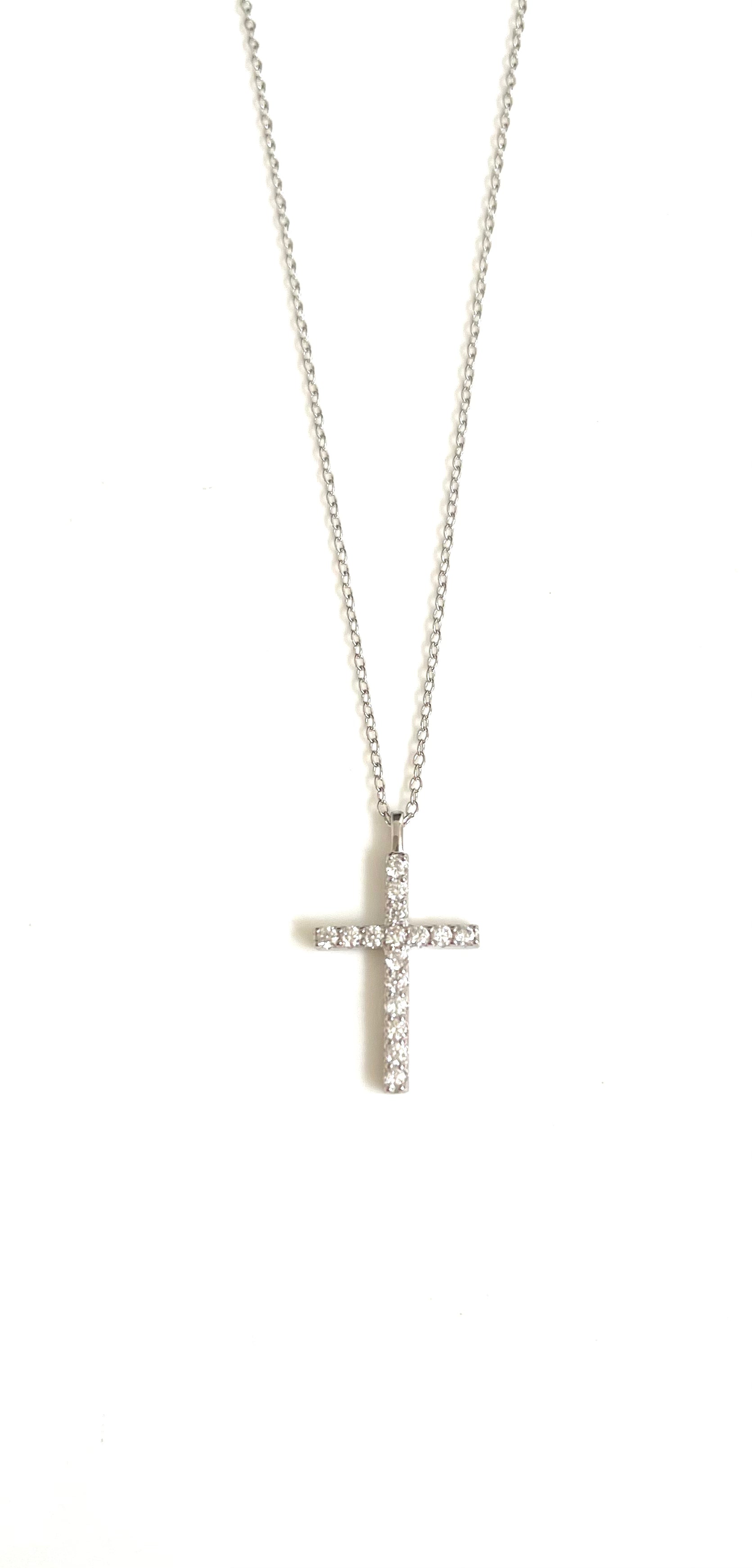 a sleek cross pendant adorned with brilliant cut stones, offering clean lines and luminous clarity. This piece is a modern essential- understated yet unforgettable.