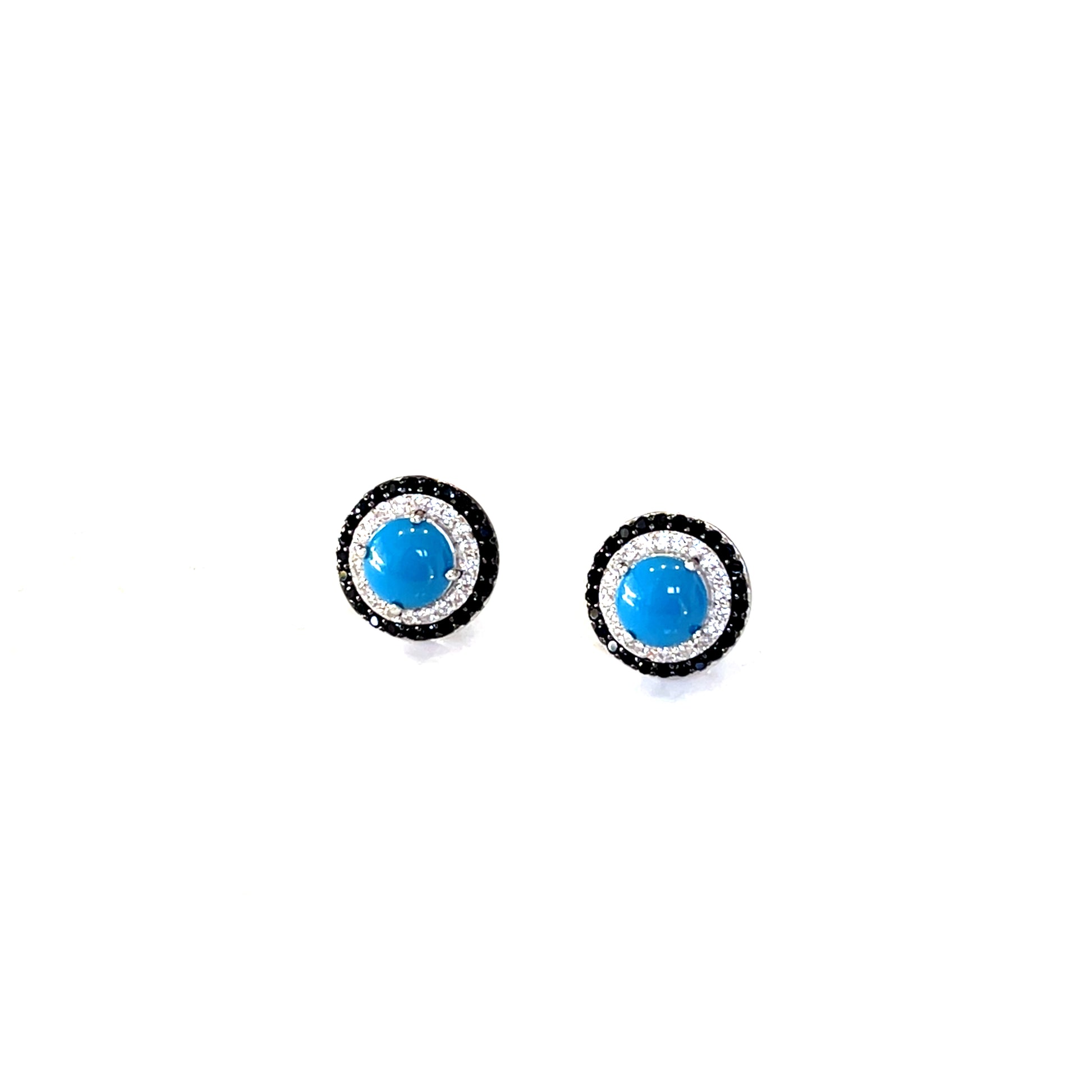 Crafted in luminous sterling silver, these stud earrings radiate serenity and strength. A central round of blue nano turquoise anchors the design, symbolizing clarity and protection. Surrounding it, halo of black and sparkle CZ with shimmering accents evokes the watchful grace of the evil eye—an ancient emblem of divine guardianship. Elegant yet powerful, these earrings offer a modern talisman for everyday luxury.