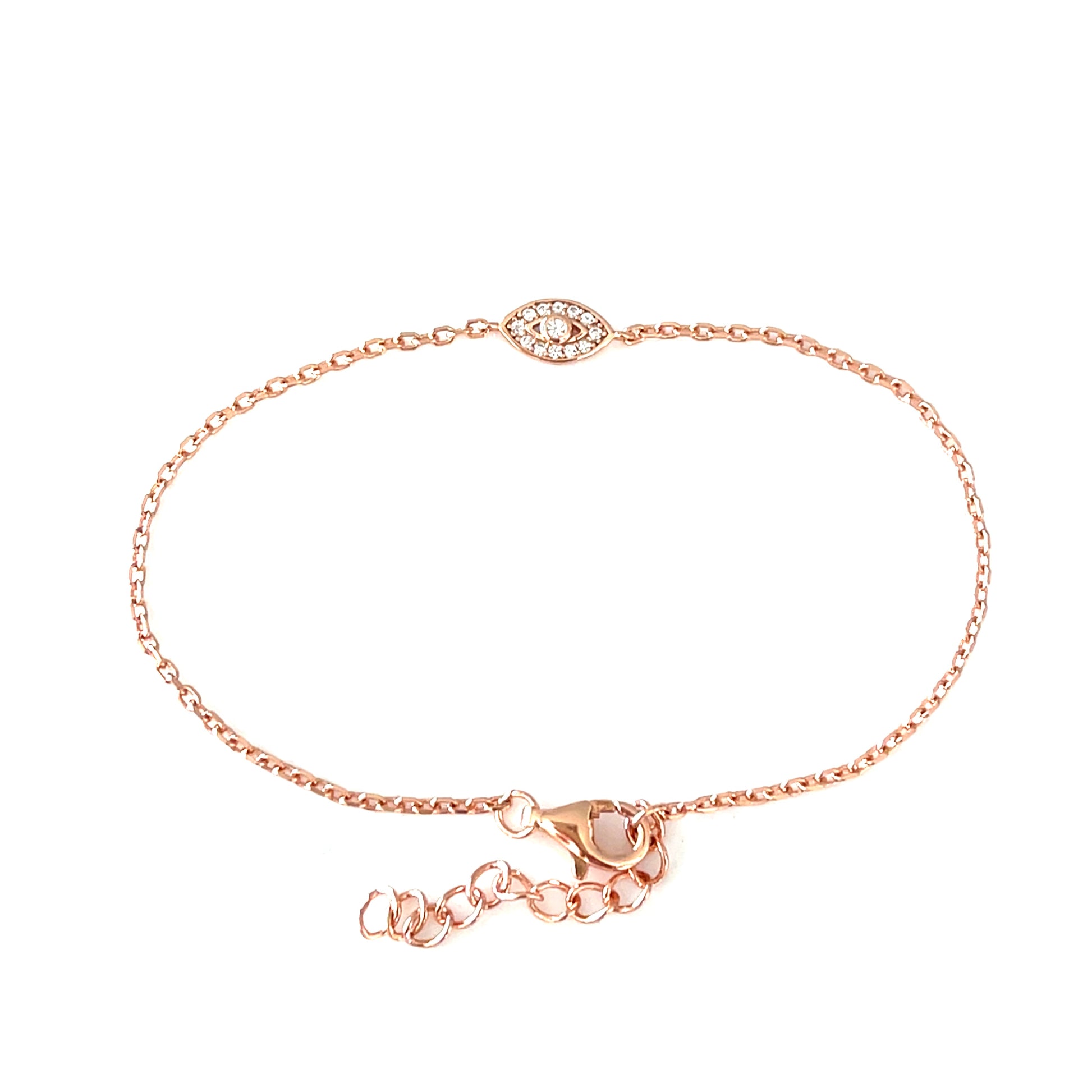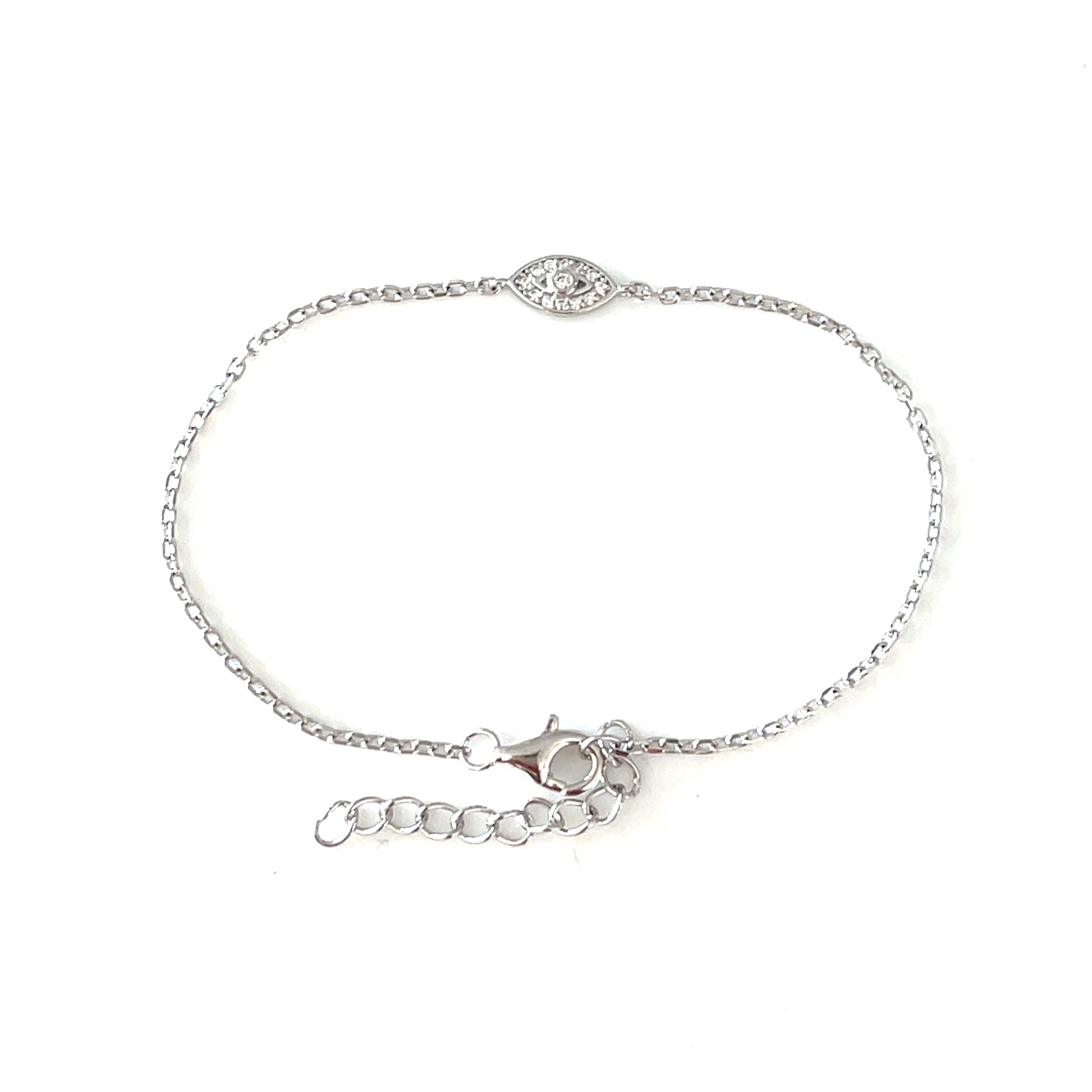 This delicate bracelet features a fine chain and a central eye charm encrusted with cubic zirconia. Plated in yellow gold, rose gold, and rhodium over sterling silver, it blends minimalist luxury with protective symbolism.