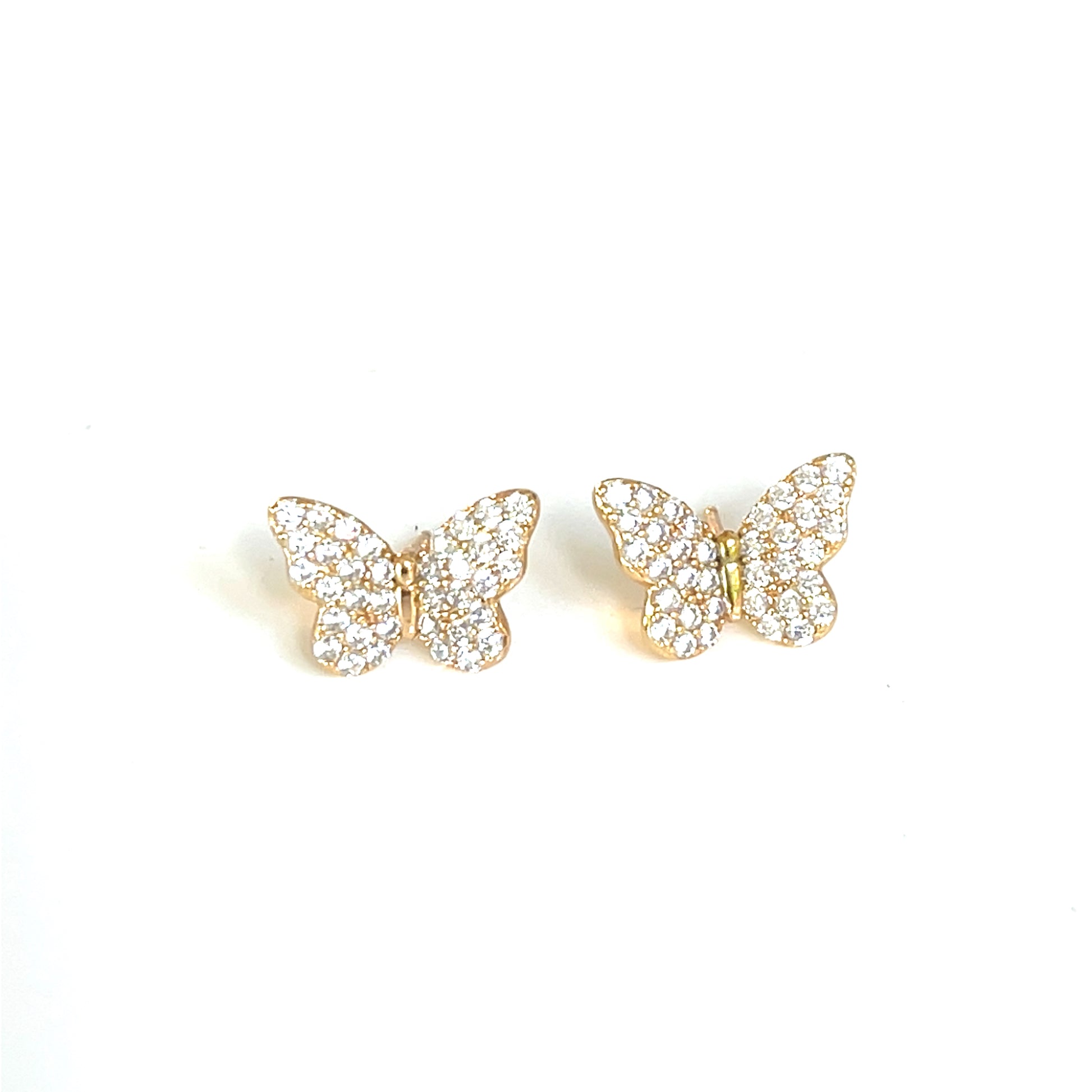 A dazzling pair of butterfly-shaped earrings crafted in gold-tone, and rhodium color sterling silver, encrusted with brilliant cubic zirconia across symmetrical wings. This studs shimmer with every movement, offering a luxurious sparkle perfect for festive occasions or everyday glamour.