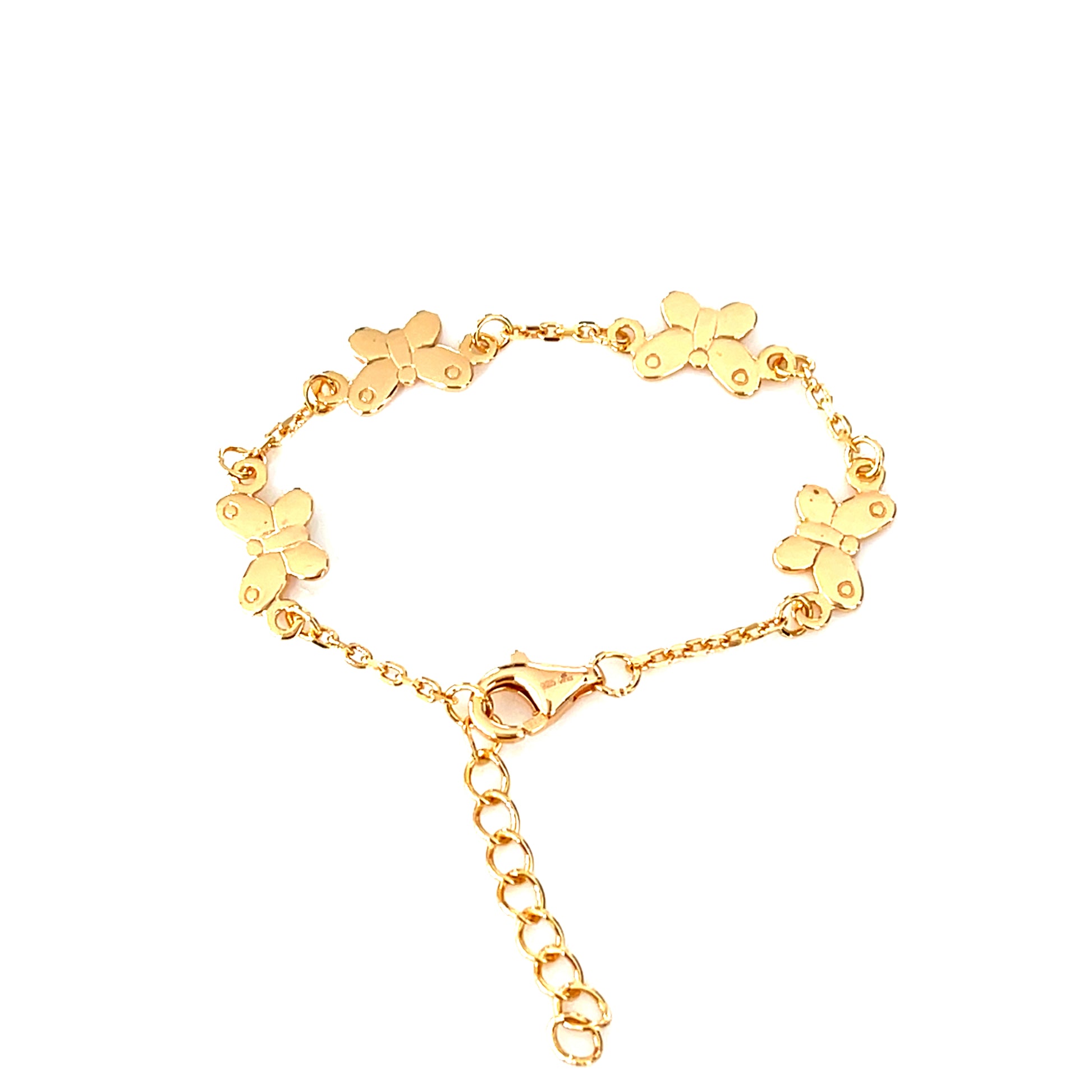 Whimsy in every wing. This delicate gold-tone sterling silver bracelet showcases a parade of butterfly-shaped charms, each etched with graceful detail to evoke transformation and joy. Lightweight and luminous, it’s a celebration of childhood wonder and elegance. Finished with an adjustable clasp for a perfect fit through every fluttering moment.