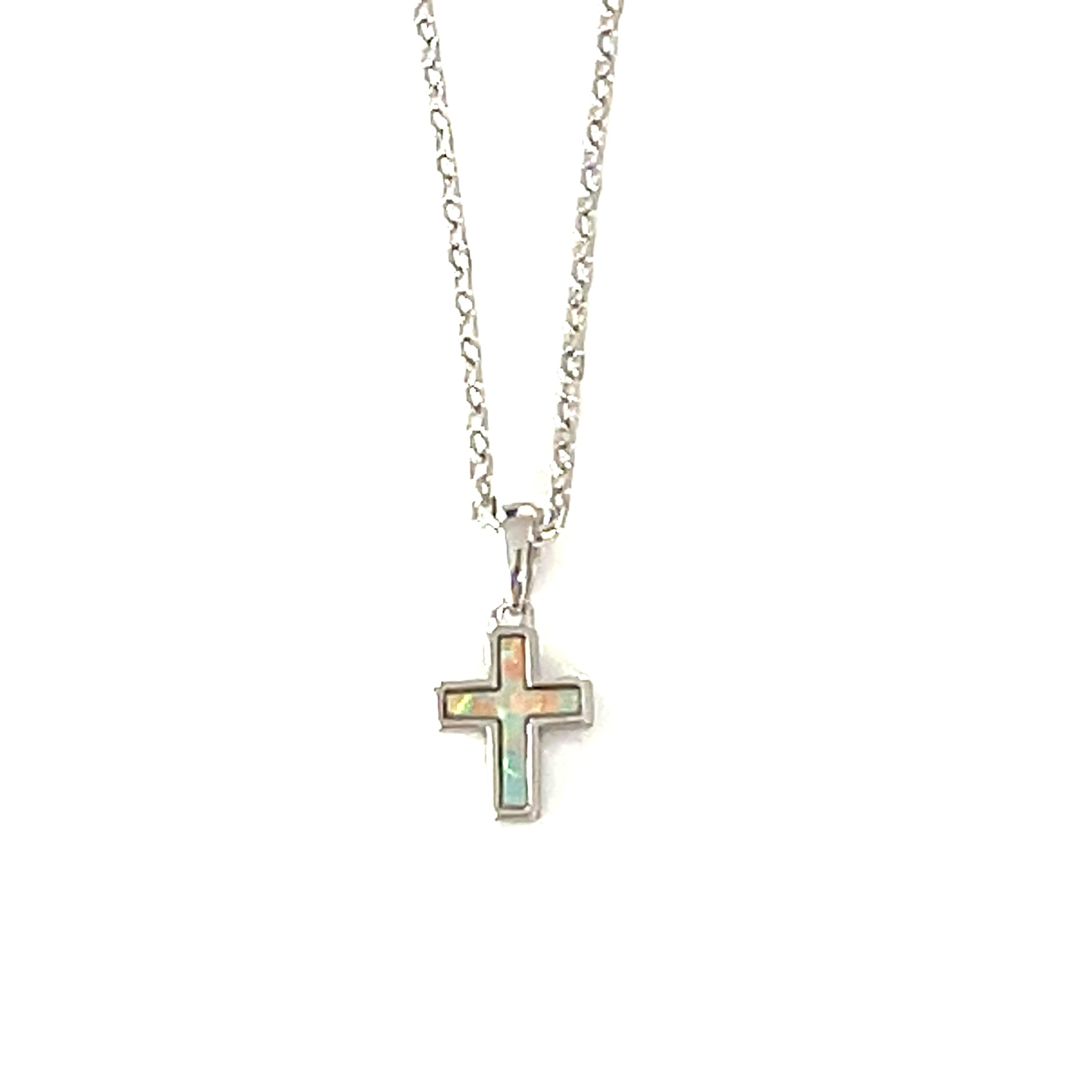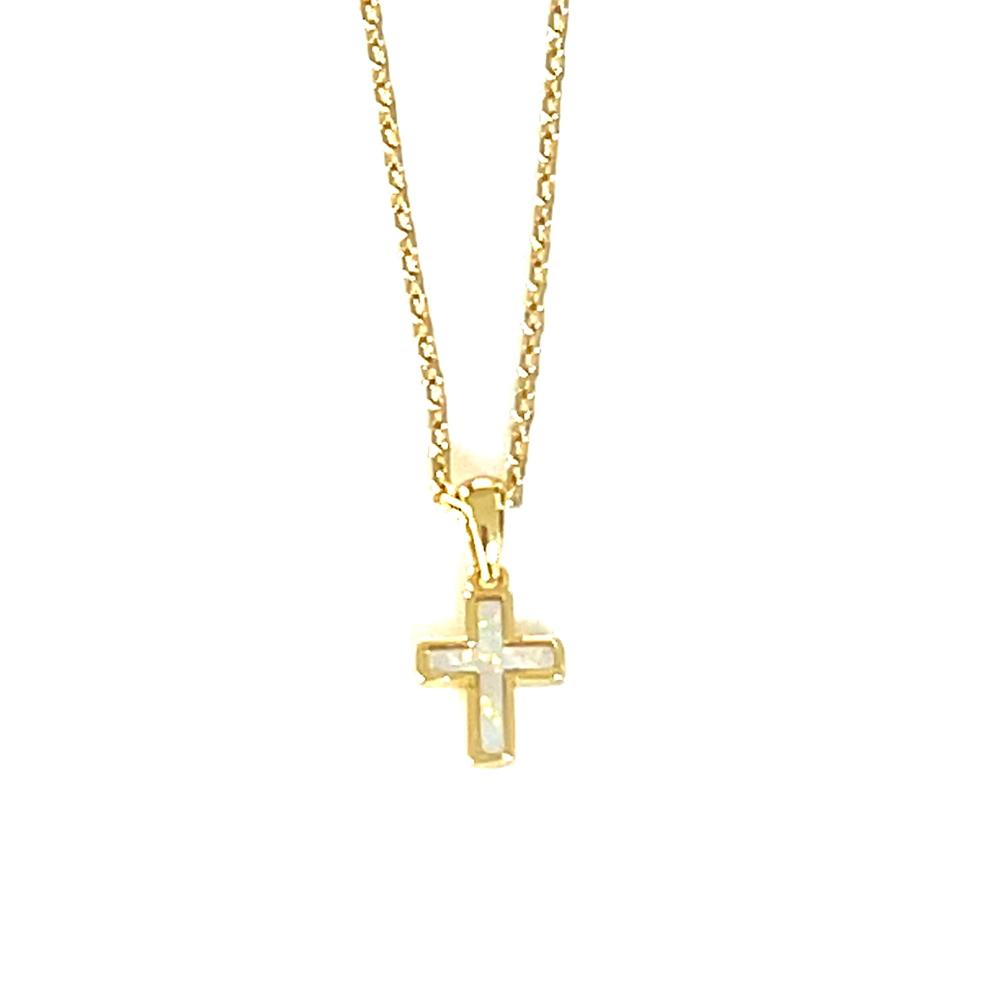 A luminous cross pendant in yellow gold-tone, rose gold-tone, and rhodium plated sterling silver, featuring a soft white opalite inlay. Its compact size adds a whisper of grace to any neckline, ideal for everyday wear or spiritual keepsakes. Durable cable chain 42+3 cm extension.
