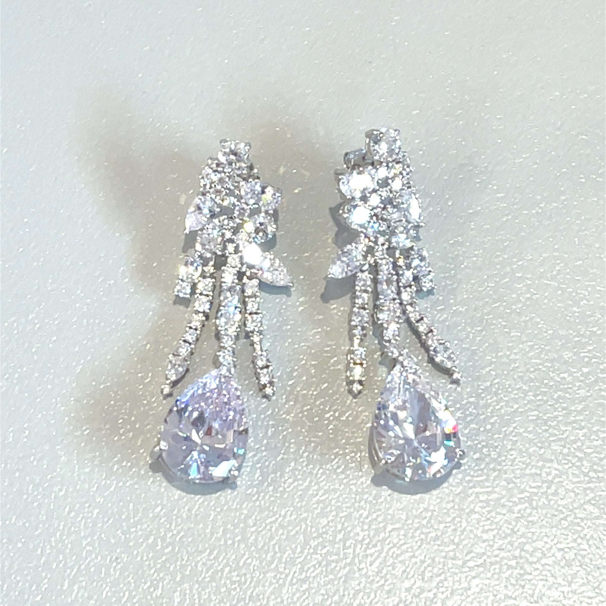 Floral sparkle, cascading drama. These earrings bloom with clustered cubic zirconia stones at the top, flowing into delicate strands that end in bold teardrop CZ gems. Designed to mesmerize, they evoke romance, movement, and radiant celebration.