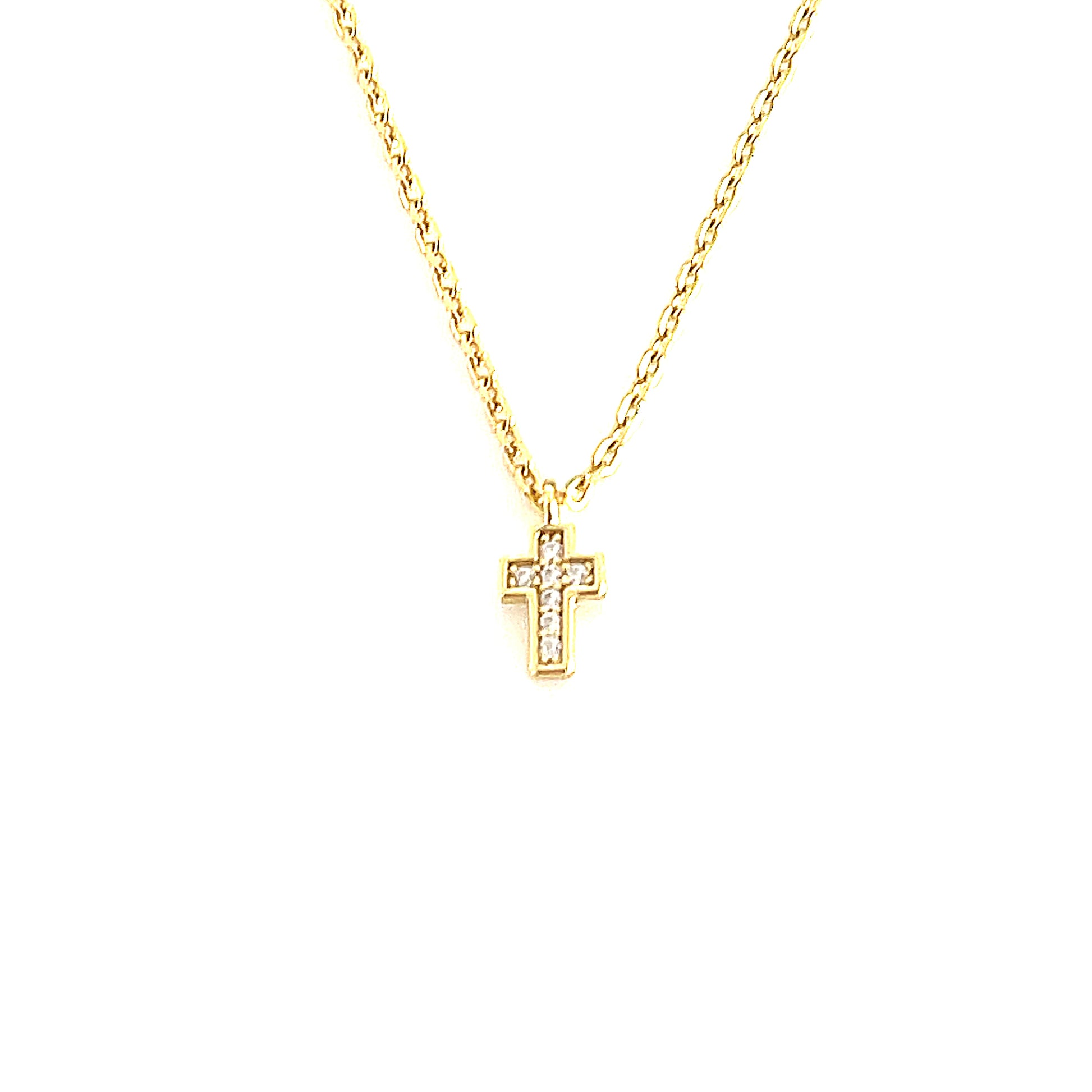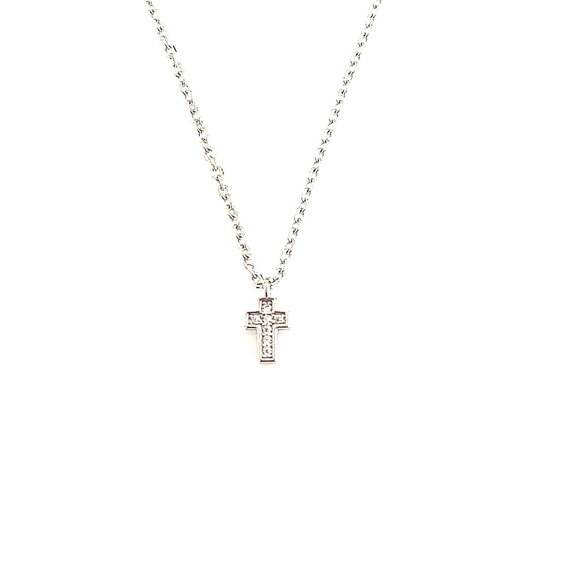 Sterling Silver with CZ – Petite Pendant on Classic cable Chain Delicate and divine, this petite cross pendant shimmers with a single vertical line of CZ stones, offering a subtle yet powerful symbol of faith. Crafted in sterling silver and suspended from a classic cable chain, it’s perfect for layering or gifting as a quiet expression of grace and devotion.