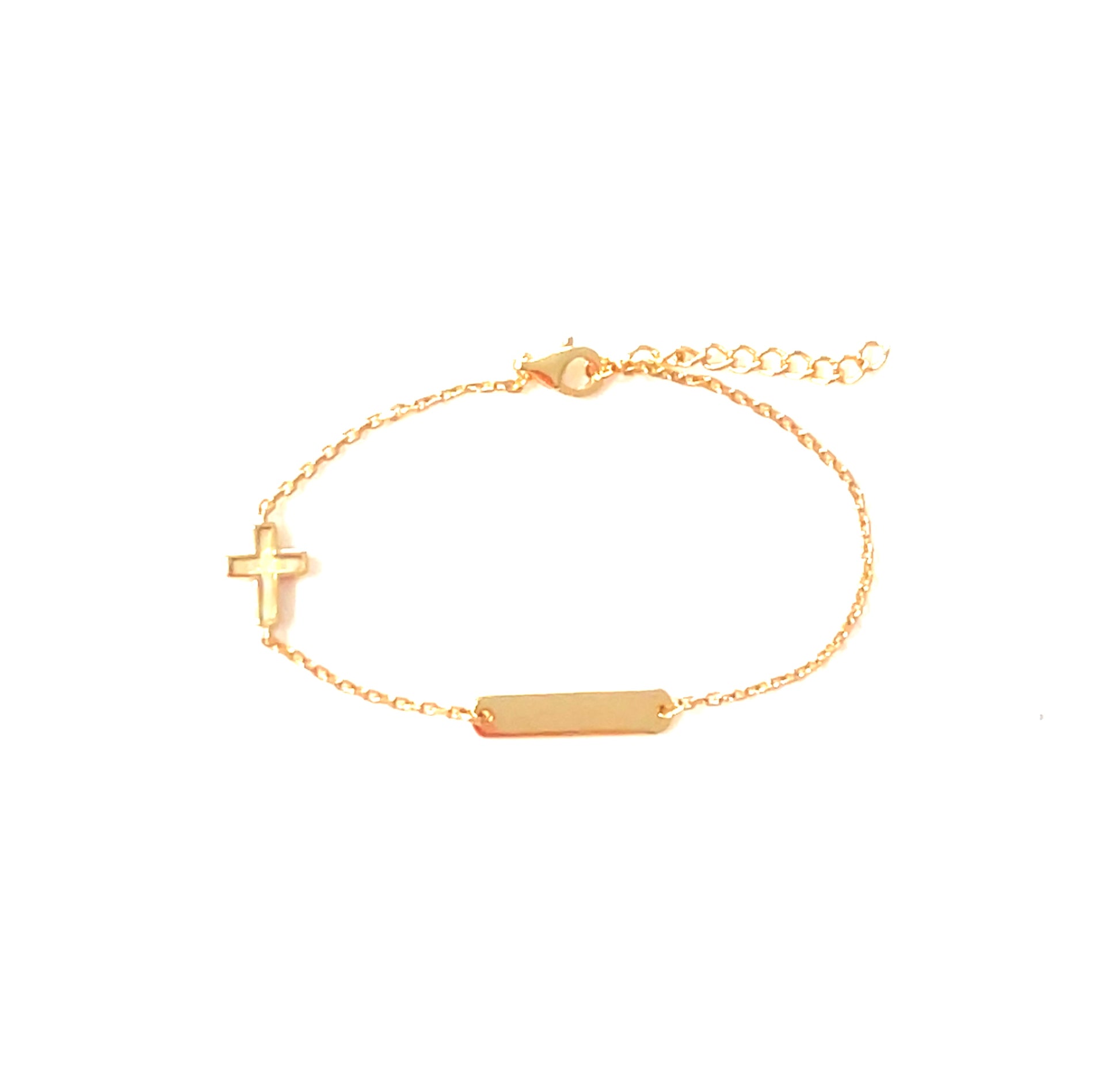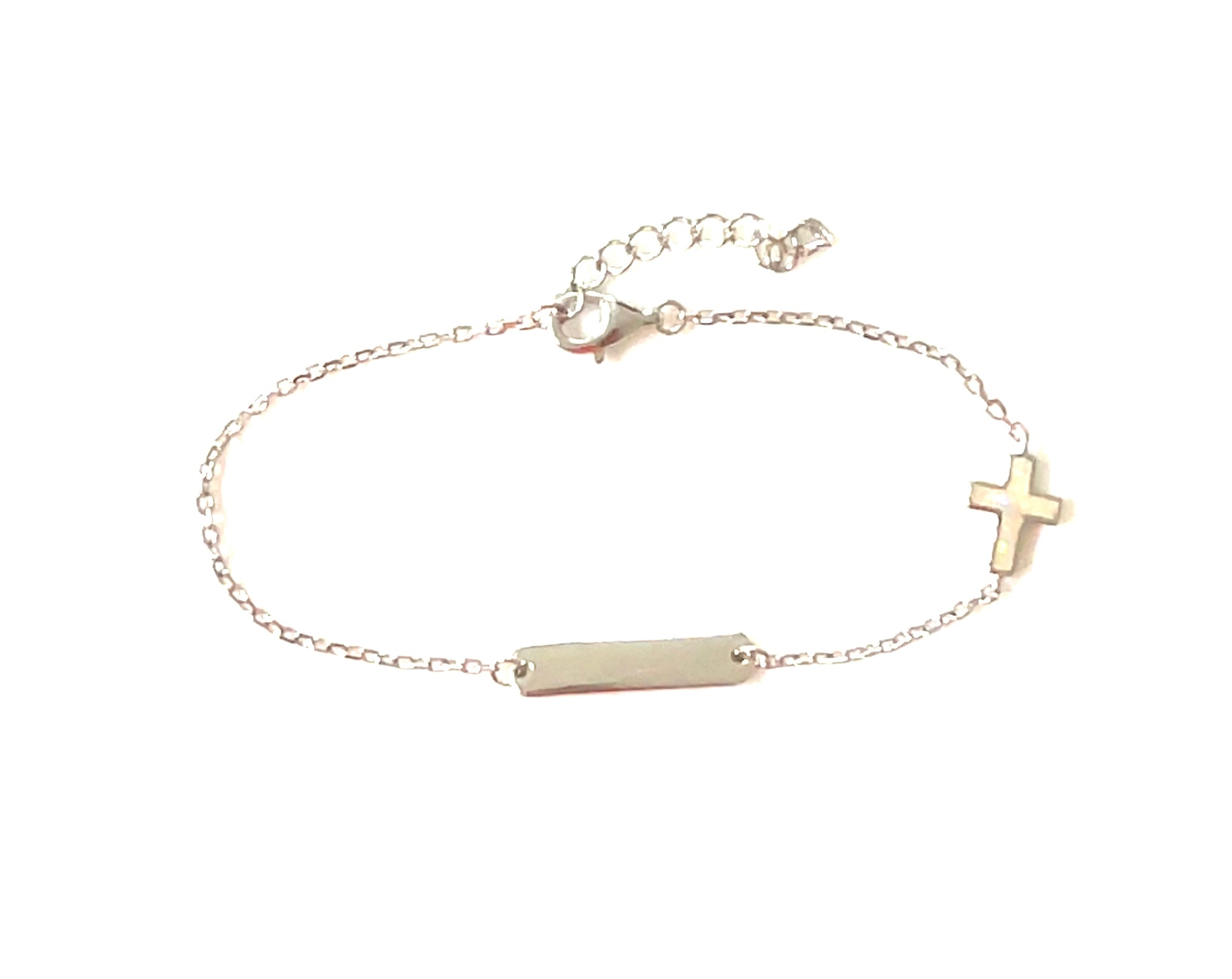 Crafted in 925 sterling silver, in polished solid silver tag-engravable bracelet. This bracelet showcases a prominent cross inlaid with subtle white opalite, set atop design for a sleek, modern finish.